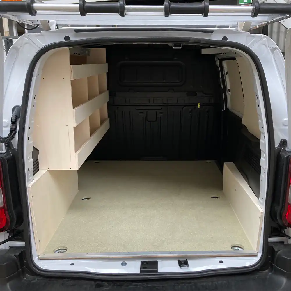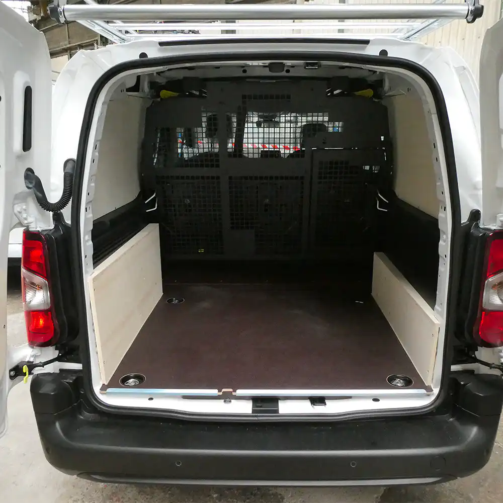 Le Citroën Berlingo offre un excellent compromis entre maniabilité en ville et capacité de chargement. AVD optimise son espace avec des aménagements sur mesure : plancher antidérapant, habillage sur les parois, rangements fonctionnels en bois découpés au millimètre, et options complémentaires comme des étagères, tiroirs ou rails d’arrimage.